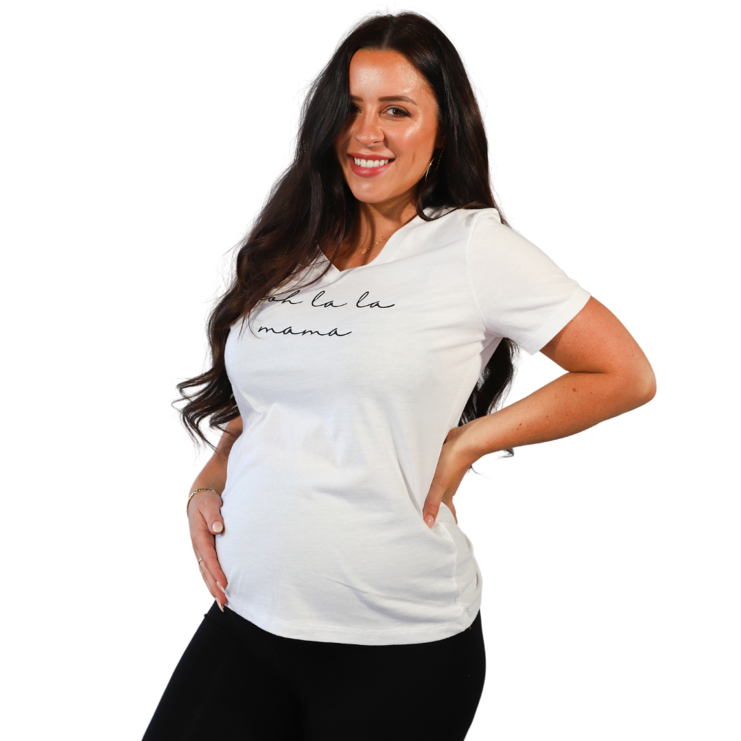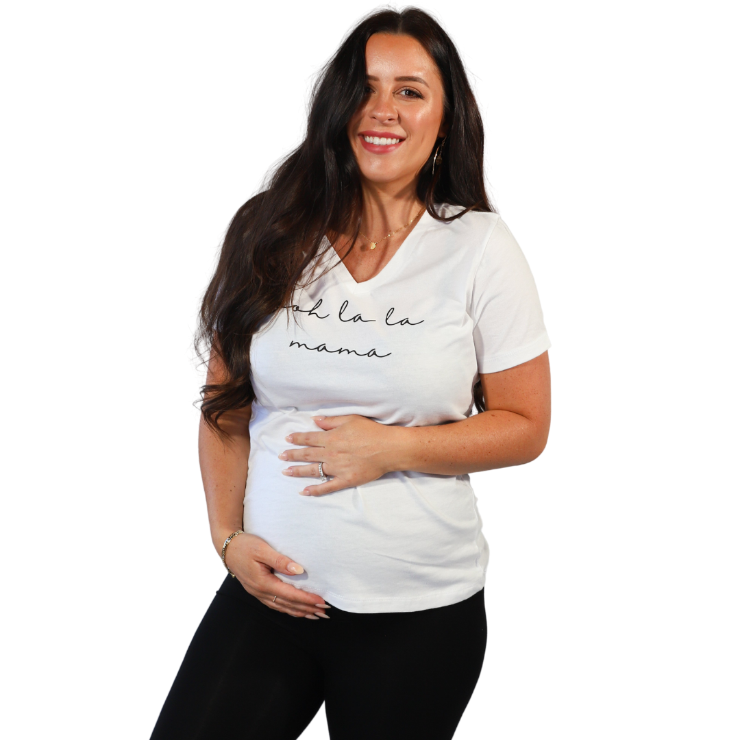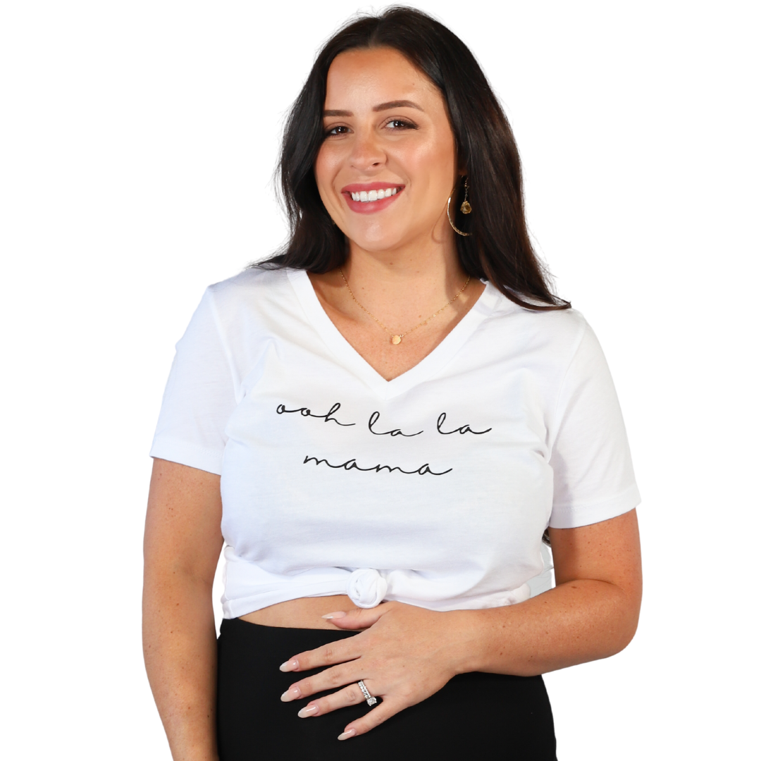 Your new favorite relaxed tee but better! The perfect embroidered Ooh La La Mama V-neck women's jersey t-shirt from BELLA+CANVAS®. Looser is a relaxed fit to wear throughout your pregnancy into nursing.